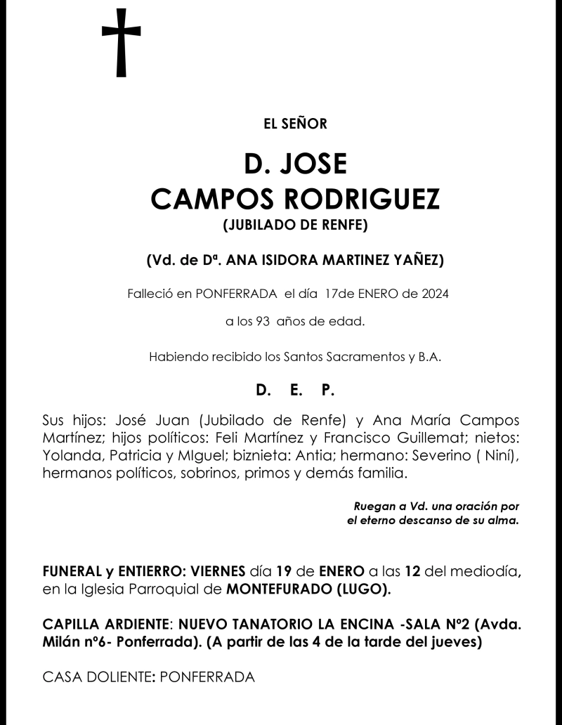Esquelas JOSE CAMPOS RODRIGUEZ 18 de Enero de 2024 Comentarios Guardar JOSE CAMPOS RODRIGUEZ Temas Esquelas Bierzo Esquelas Ponferrada Esquelas