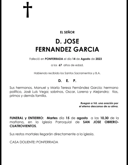 Esquelas JOSE FERNANDEZ GARCIA 14 de Agosto de 2023 Comentarios Guardar JOSE FERNANDEZ GARCIA Temas Esquelas Bierzo