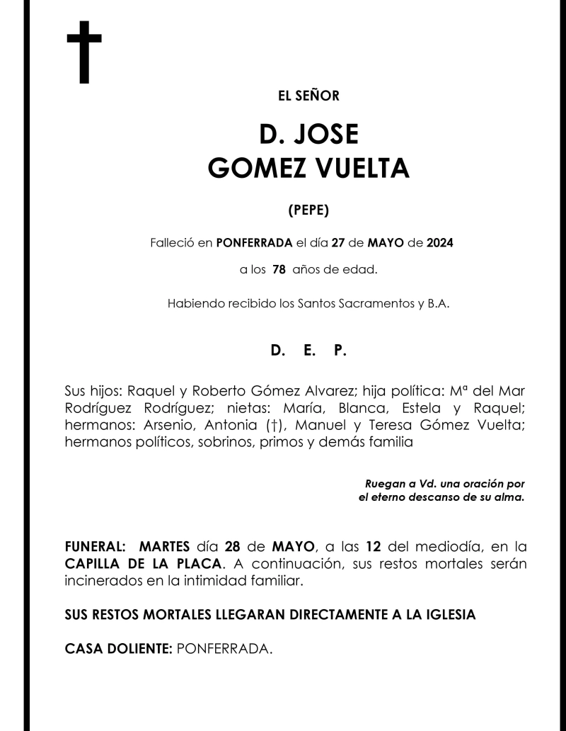 Esquelas JOSE GOMEZ VUELTA 27 de Mayo de 2024 Comentarios Guardar JOSE GOMEZ VUELTA Temas Esquelas Bierzo Esquelas Ponferrada Esquelas