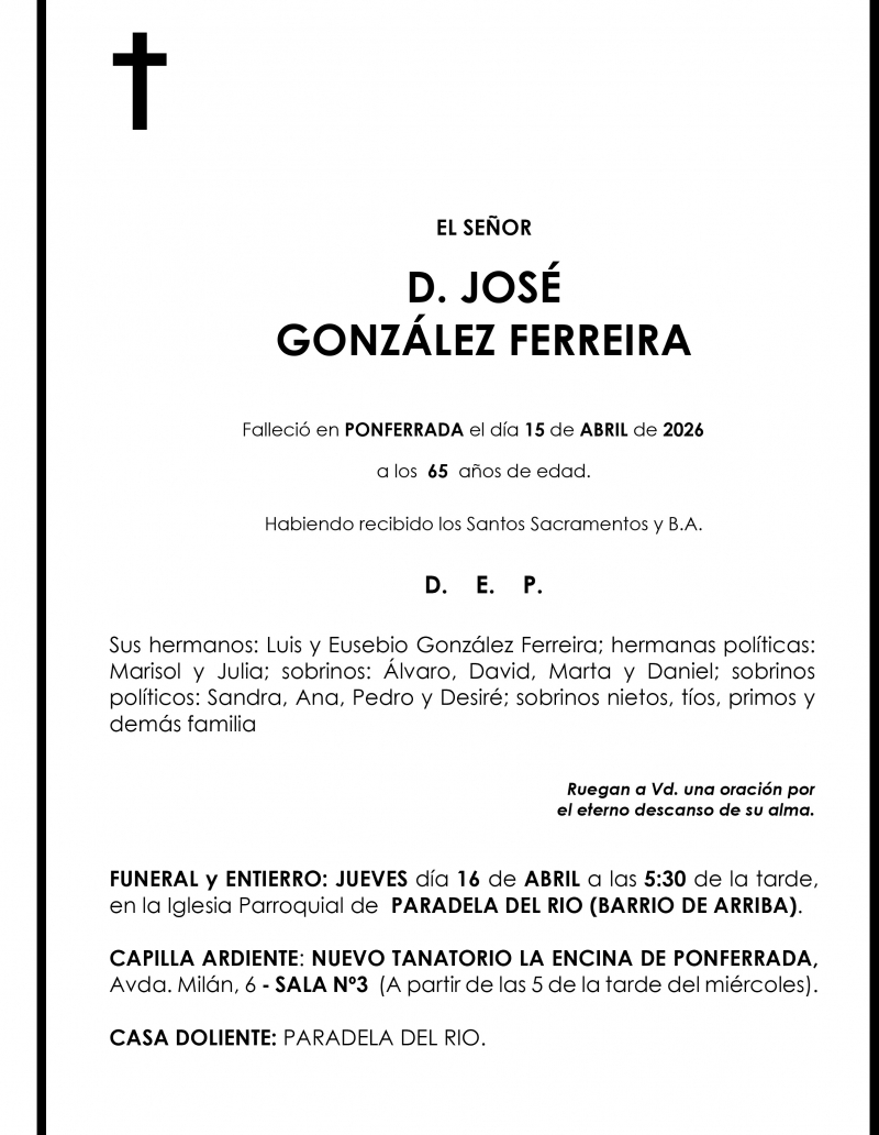 Esquelas JOSE GONZALEZ FERREIRA Redacción Infobierzo 15 de Abril de 2026 Comentarios Guardar JOSE GONZALEZ FERREIRA JOSE GONZALEZ FERREIRA Temas Esquelas Bierzo Esquelas Ponferrada Esquelas