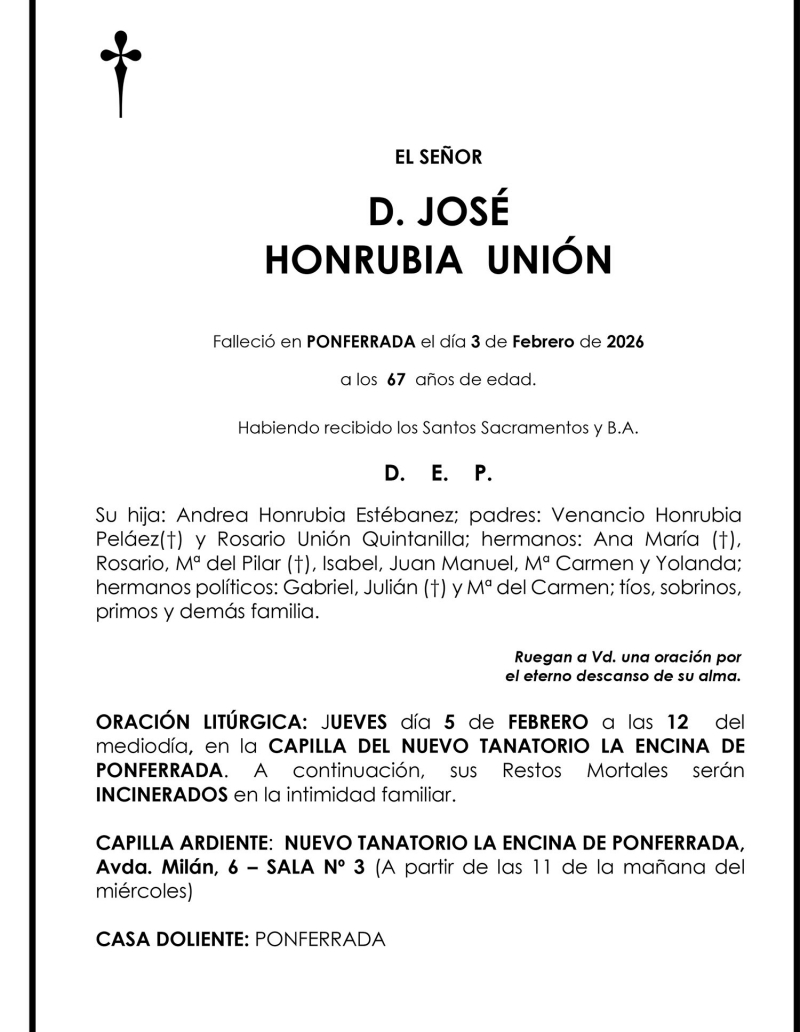 Esquelas JOSÉ HONRUBIA UNIÓN Redacción Infobierzo 04 de Febrero de 2026 Actualizado: 04 de Febrero de 2026 a las 19:05 Comentarios Guardar JOSÉ HONRUBIA UNIÓN JOSÉ HONRUBIA UNIÓN Temas Esquelas Ponferrada Esquelas Bierzo Esquelas