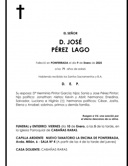 Esquelas JOSE PEREZ LAGO Redacción Infobierzo 09 de Enero de 2025 Comentarios Guardar JOSE PEREZ LAGO Temas Esquelas Bierzo Esquelas Ponferrada Esquelas