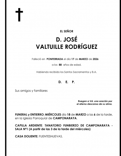 Esquelas JOSE VALTUILLE RODRIGUEZ Redacción Infobierzo 17 de Marzo de 2026 Actualizado: 17 de Marzo de 2026 a las 16:20 Comentarios Guardar JOSE VALTUILLE RODRIGUEZ JOSE VALTUILLE RODRIGUEZ Temas Esquelas Bierzo Esquelas Ponferrada Esquelas