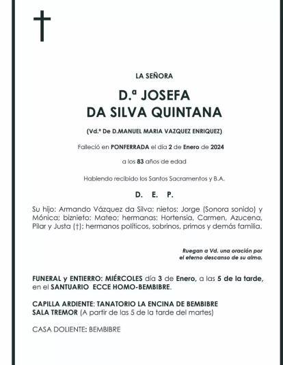 Esquelas JOSEFA DA SILVA QUINTANA 02 de Enero de 2024 Comentarios Guardar JOSEFA DA SILVA QUINTANA Temas Esquelas Bierzo Esquelas Ponferrada Esquelas