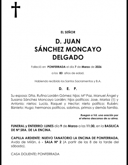 Esquelas JUAN SÁNCHEZ MONCAYO DELGADO Redacción Infobierzo 07 de Marzo de 2026 Actualizado: 07 de Marzo de 2026 a las 18:58 Comentarios Guardar JUAN SÁNCHEZ MONCAYO DELGADO JUAN SÁNCHEZ MONCAYO DELGADO Temas Esquelas Bierzo Esquelas Ponferrada Esquelas