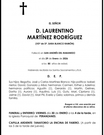 Esquelas LAURENTINO MARTINEZ RODRIGUEZ Redacción Infobierzo 29 de Enero de 2026 Comentarios Guardar LAURENTINO MARTINEZ RODRIGUEZ LAURENTINO MARTINEZ RODRIGUEZ Temas Esquelas Bierzo Esquelas Ponferrada Esquelas