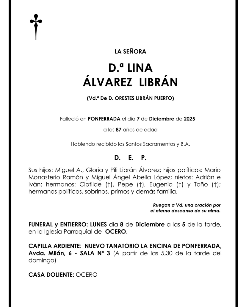 Esquelas LINA ÁLVAREZ LIBRÁN Redacción Infobierzo 07 de Diciembre de 2025 Actualizado: 07 de Diciembre de 2025 a las 18:26 Comentarios Guardar LINA ÁLVAREZ LIBRÁN LINA ÁLVAREZ LIBRÁN Temas Esquelas Bierzo Esquelas Ponferrada Esquelas
