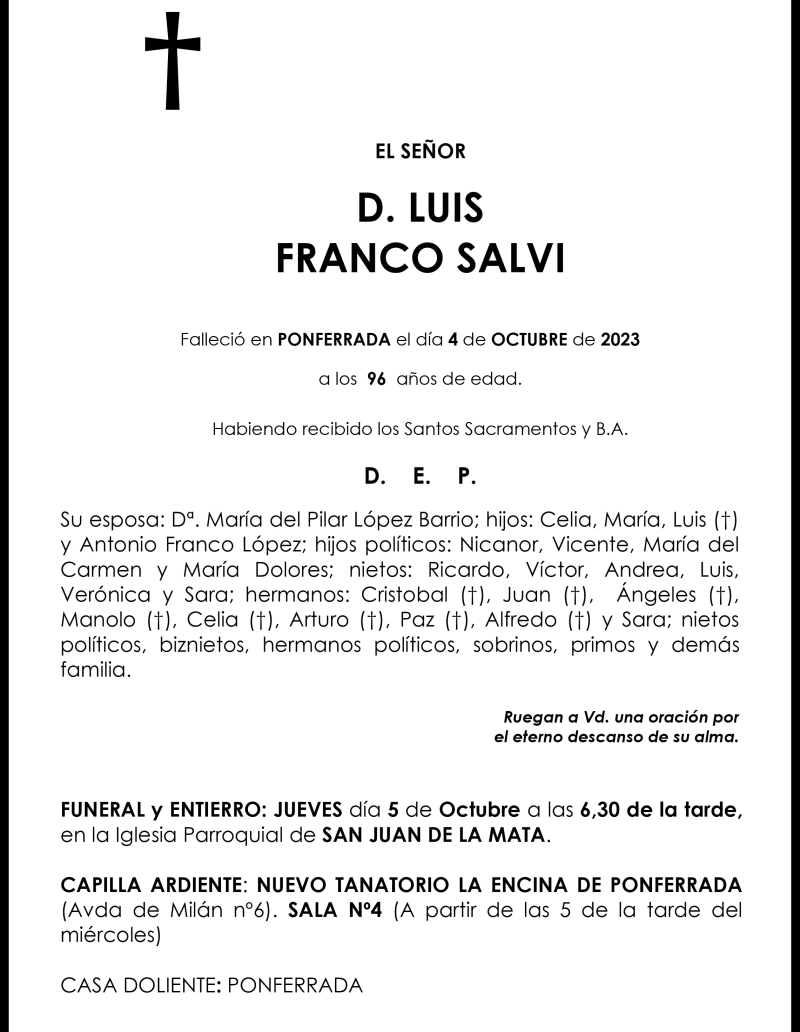 Esquelas LUIS FRANCO SALVI 05 de Octubre de 2023 Comentarios Guardar LUIS FRANCO SALVI Temas Esquelas Bierzo Esquelas Ponferrada Esquelas