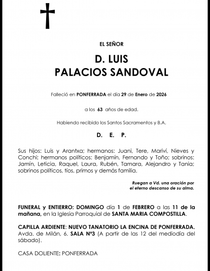 Esquelas LUIS PALACIOS SANDOVAL Redacción Infobierzo 30 de Enero de 2026 Comentarios Guardar LUIS PALACIOS SANDOVAL LUIS PALACIOS SANDOVAL Temas Esquelas Bierzo Esquelas Ponferrada Esquelas