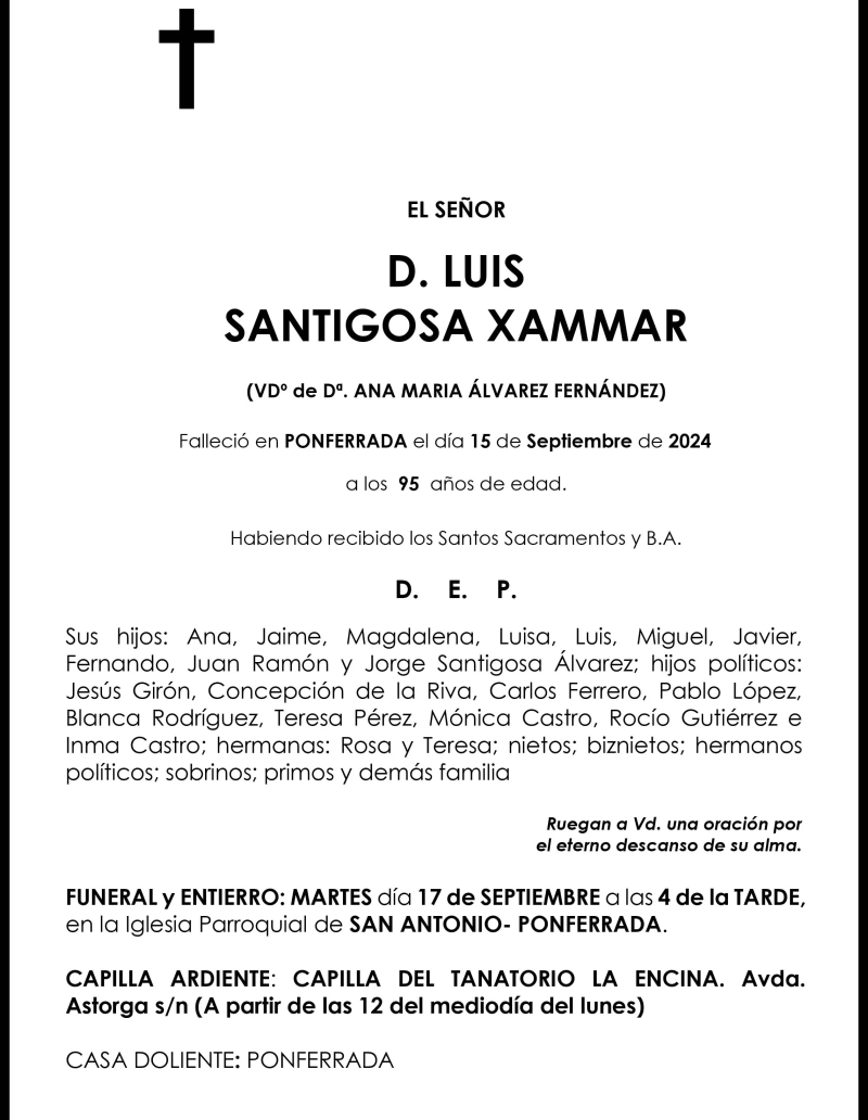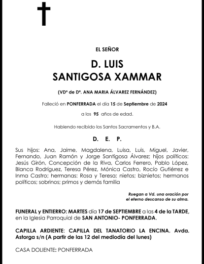 Esquelas LUIS SANTIGOSA XAMMAR Redacción Infobierzo 16 de Septiembre de 2024 Comentarios Guardar LUIS SANTIGOSA XAMMAR Temas Esquelas Bierzo Esquelas Ponferrada Esquelas