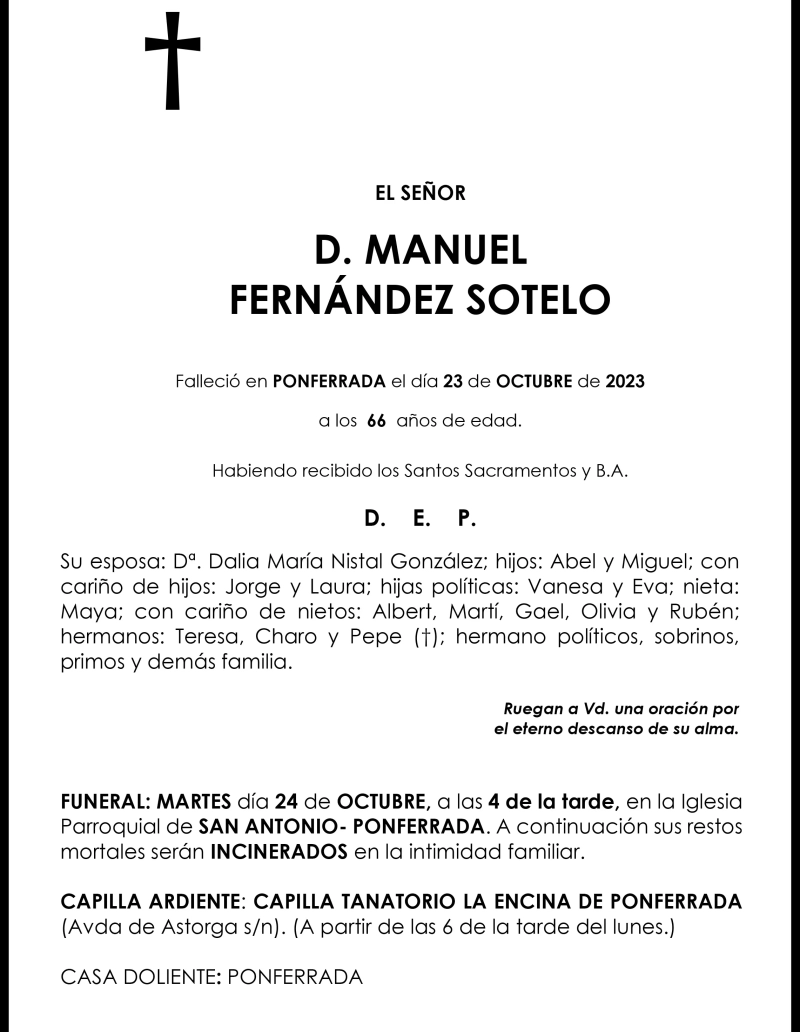 Esquelas MANUEL FERNÁNDEZ SOTELO 23 de Octubre de 2023 Comentarios Guardar MANUEL FERNÁNDEZ SOTELO Temas Esquelas Bierzo Esquelas Ponferrada Esquelas