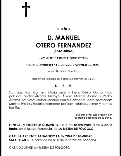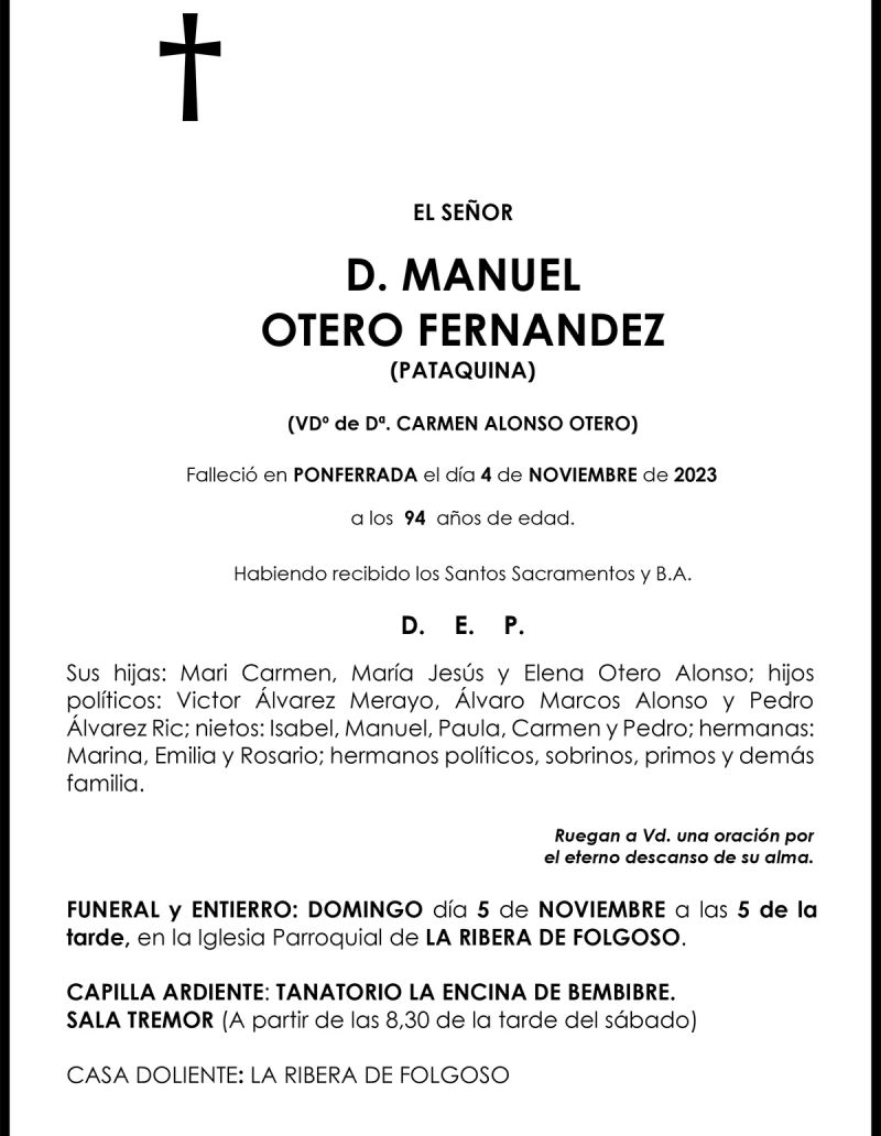 Esquelas MANUEL OTERO FERNÁNDEZ 04 de Noviembre de 2023 Comentarios Guardar MANUEL OTERO FERNÁNDEZ Temas Esquelas Bierzo Esquelas Esquelas Ponferrada