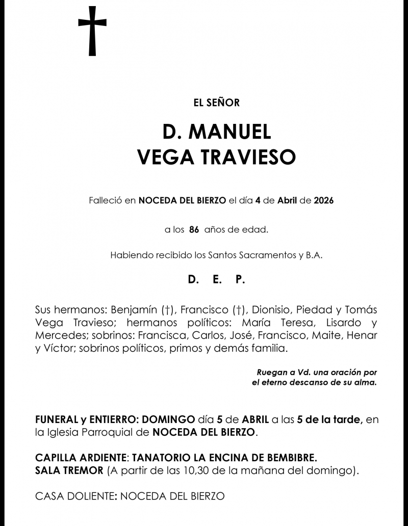 Esquelas MANUEL VEGA TRAVIESO Redacción Infobierzo 04 de Abril de 2026 Actualizado: 04 de Abril de 2026 a las 15:59 Comentarios Guardar MANUEL VEGA TRAVIESO MANUEL VEGA TRAVIESO Temas Esquelas Bierzo Esquelas Ponferrada Esquelas