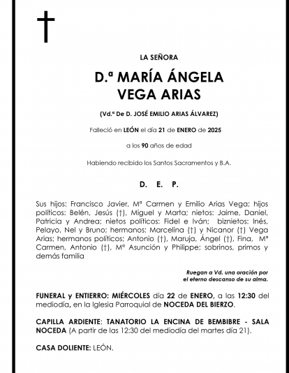 Esquelas MARIA ANGELA VEGA ARIAS Redacción Infobierzo 21 de Enero de 2025 Comentarios Guardar MARIA ANGELA VEGA ARIAS Temas Esquelas Bierzo Esquelas Ponferrada Esquelas