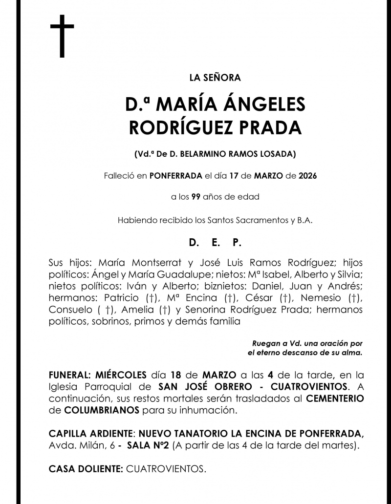Esquelas MARIA ANGELES RODRIGUEZ PRADA Redacción Infobierzo 17 de Marzo de 2026 Actualizado: 17 de Marzo de 2026 a las 16:19 Comentarios Guardar MARIA ANGELES RODRIGUEZ PRADA MARIA ANGELES RODRIGUEZ PRADA Temas Esquelas Bierzo Esquelas Ponferrada Esquelas