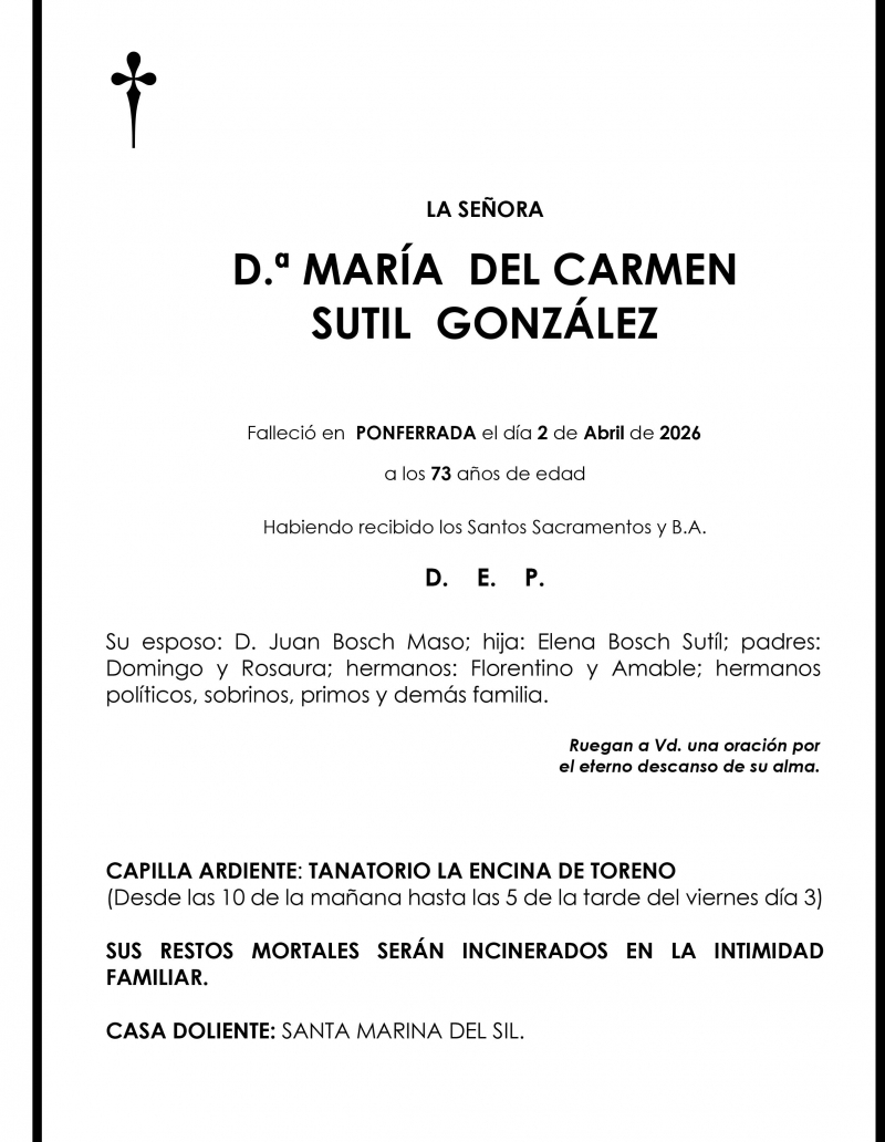 Esquelas MARIA DEL CARMEN SUTIL GONZALEZ Redacción Infobierzo 02 de Abril de 2026 Actualizado: 02 de Abril de 2026 a las 17:48 Comentarios Guardar MARIA DEL CARMEN SUTIL GONZALEZ MARIA DEL CARMEN SUTIL GONZALEZ Temas Esquelas Bierzo Bodegas Emilio Moro Esquelas