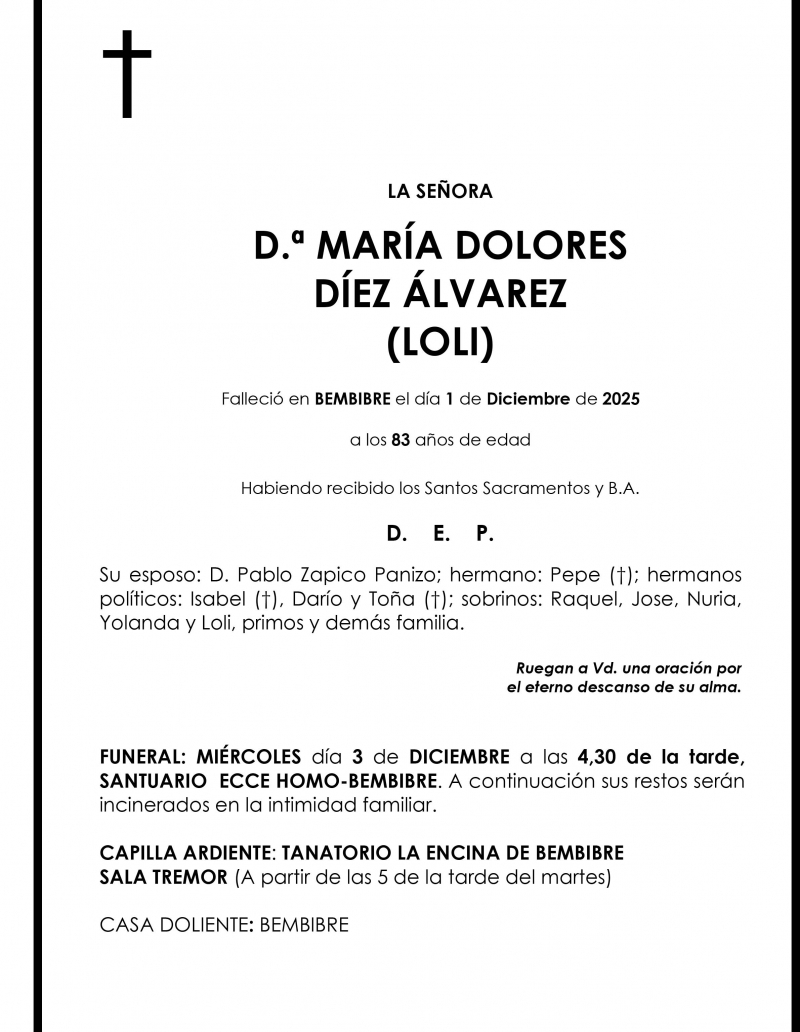 Esquelas MARIA DOLORES DIEZ ALVAREZ - LOLI Redacción Infobierzo 02 de Diciembre de 2025 Comentarios Guardar MARIA DOLORES DIEZ ALVAREZ LOLI MARIA DOLORES DIEZ ALVAREZ LOLI Temas Esquelas Bierzo Esquelas Ponferrada Esquelas