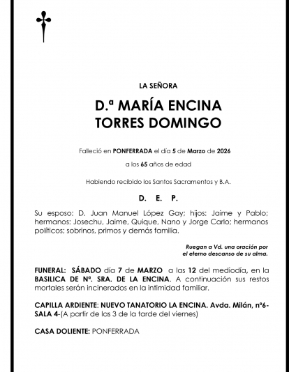 Esquelas MARÍA ENCINA TORRES DOMINGO Redacción Infobierzo 06 de Marzo de 2026 Actualizado: 06 de Marzo de 2026 a las 20:15 Comentarios Guardar MARÍA ENCINA TORRES DOMINGO MARÍA ENCINA TORRES DOMINGO Temas Esquelas Bierzo Esquelas Ponferrada Esquelas