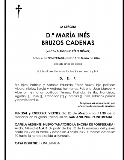 Esquelas MARIA INES BRUZOS CADENAS Redacción Infobierzo 19 de Marzo de 2026 Comentarios Guardar MARIA INES BRUZOS CADENAS MARIA INES BRUZOS CADENAS Temas Esquelas Bierzo Esquelas Ponferrada Esquelas