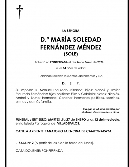 Esquelas MARÍA SOLEDAD FERNÁNDEZ MÉNDEZ (SOLE) Redacción Infobierzo 26 de Enero de 2026 Actualizado: 26 de Enero de 2026 a las 20:14 Comentarios Guardar MARÍA SOLEDAD FERNÁNDEZ MÉNDEZ (SOLE) MARÍA SOLEDAD FERNÁNDEZ MÉNDEZ (SOLE) Temas Esquelas Bierzo Esquelas Ponferrada Esquelas