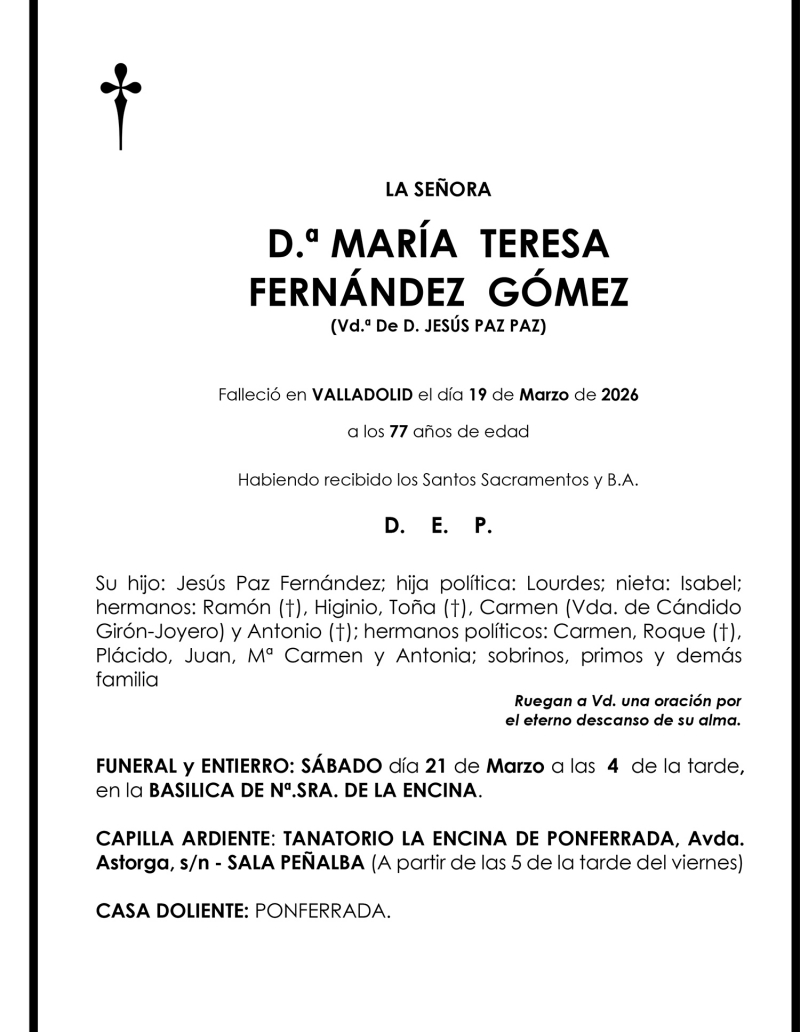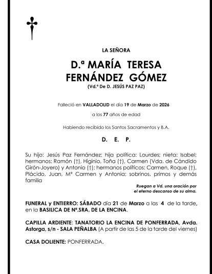 Esquelas MARÍA TERESA FERNÁNDEZ GÓMEZ Redacción Infobierzo 20 de Marzo de 2026 Actualizado: 20 de Marzo de 2026 a las 17:57 Comentarios Guardar MARÍA TERESA FERNÁNDEZ GÓMEZ MARÍA TERESA FERNÁNDEZ GÓMEZ Temas Esquelas Bierzo Esquelas Ponferrada Esquelas