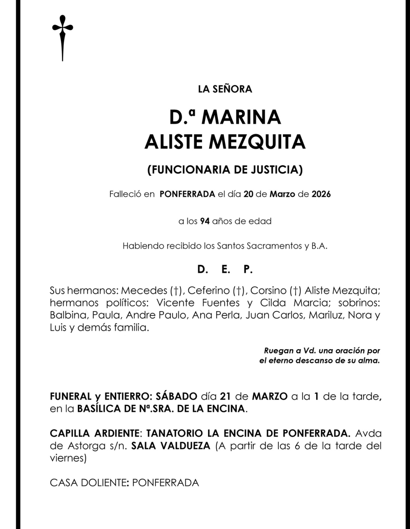 Esquelas MARINA ALISTE MEZQUITA Redacción Infobierzo 20 de Marzo de 2026 Actualizado: 20 de Marzo de 2026 a las 17:52 Comentarios Guardar MARINA ALISTE MEZQUITA MARINA ALISTE MEZQUITA Temas Esquelas Bierzo Esquelas Ponferrada Esquelas