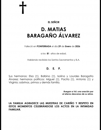 Esquelas MATIAS BARAGAÑO ALVAREZ Redacción Infobierzo 29 de Enero de 2026 Comentarios Guardar MATIAS BARAGAÑO ALVAREZ MATIAS BARAGAÑO ALVAREZ Temas Esquelas Bierzo Esquelas Ponferrada Esquelas