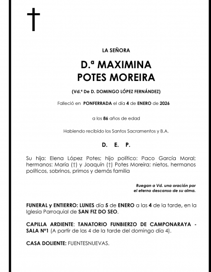 Esquelas MAXIMINA POTES MOREIRA Redacción Infobierzo 04 de Enero de 2026 Actualizado: 04 de Enero de 2026 a las 17:28 Comentarios Guardar MAXIMINA POTES MOREIRA MAXIMINA POTES MOREIRA Temas Esquelas Bierzo Esquelas Ponferrada Esquelas