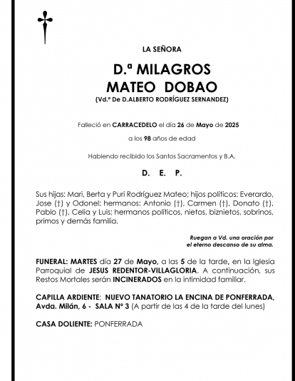Esquelas MILAGROS MATEO DOBAO Redacción Infobierzo 26 de Mayo de 2025 Comentarios Guardar MILAGROS MATEO DOBAO Temas Esquelas Bierzo Esquelas Ponferrada Esquelas