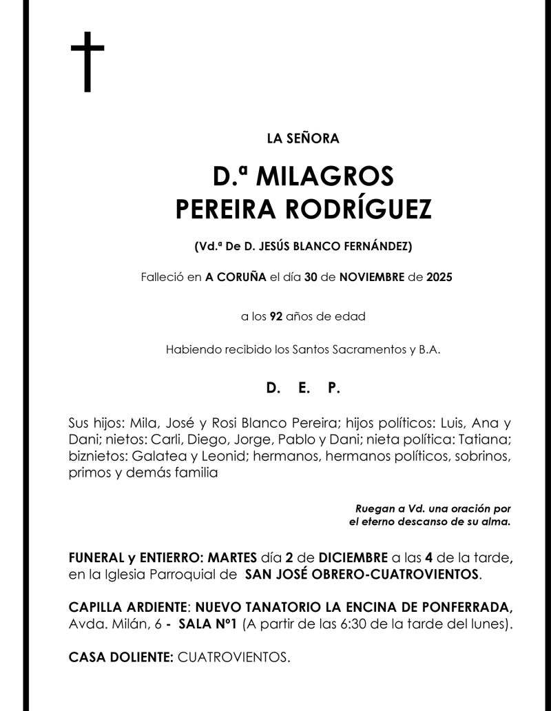 Esquelas MILAGROS PEREIRA RODRÍGUEZ Redacción Infobierzo 01 de Diciembre de 2025 Actualizado: 01 de Diciembre de 2025 a las 19:09 Comentarios Guardar MILAGROS PEREIRA RODRÍGUEZ MILAGROS PEREIRA RODRÍGUEZ Temas Esquelas Bierzo Esquelas Ponferrada Esquelas