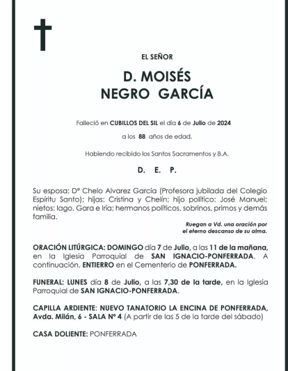 Esquelas MOISES NEGRO GARCIA 06 de Julio de 2024 Comentarios Guardar MOISES NEGRO GARCIA Temas Esquelas Ponferrada Esquelas Bierzo Esquelas