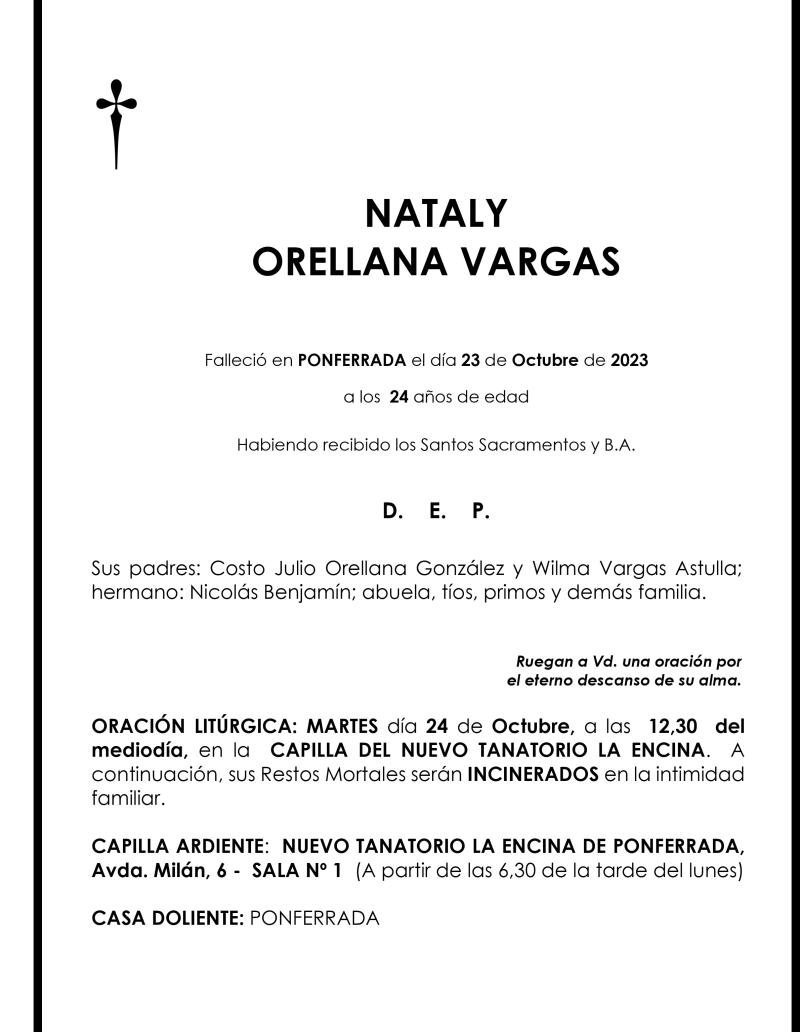 Esquelas NATALY ORELLANA VARGAS 23 de Octubre de 2023 Comentarios Guardar NATALY ORELLANA VARGAS Temas Esquelas Bierzo Esquelas Ponferrada Esquelas