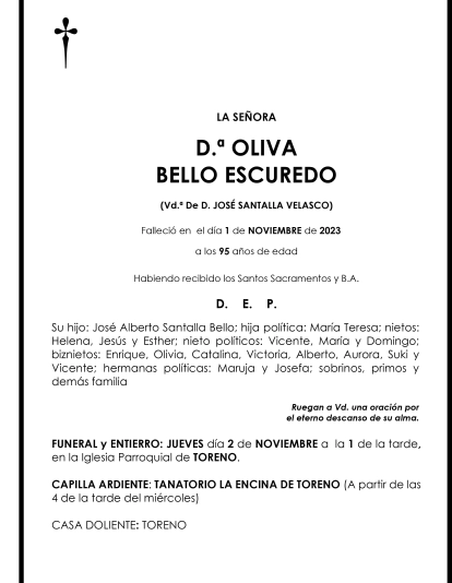 Esquelas OLIVA BELLO ESCUREDO 01 de Noviembre de 2023 Comentarios Guardar OLIVA BELLO ESCUREDO Temas Esquelas Bierzo Esquelas Ponferrada Esquelas
