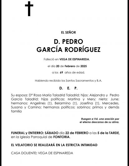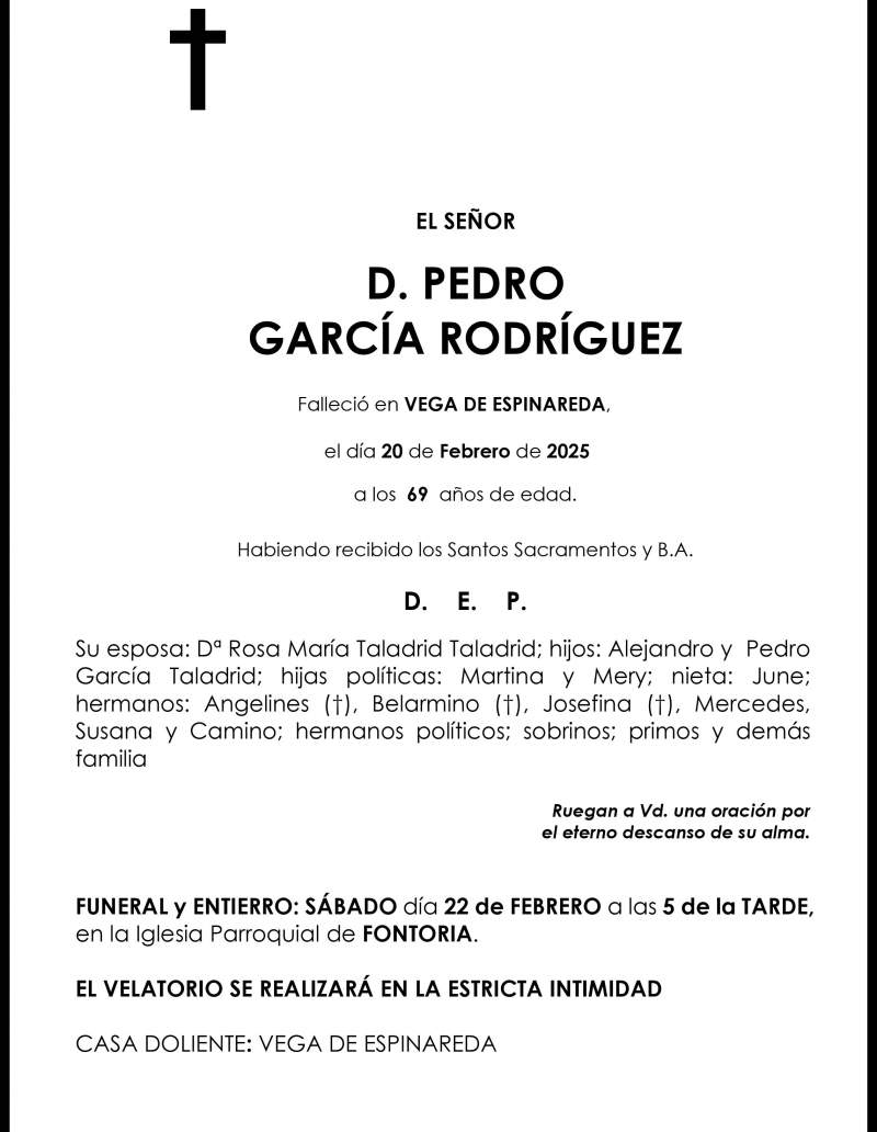 Esquelas PEDRO GARCIA RODRIGUEZ Redacción Infobierzo 21 de Febrero de 2025 Comentarios Guardar PEDRO GARCIA RODRIGUEZ Temas Esquelas Bierzo Esquelas Ponferrada Esquelas