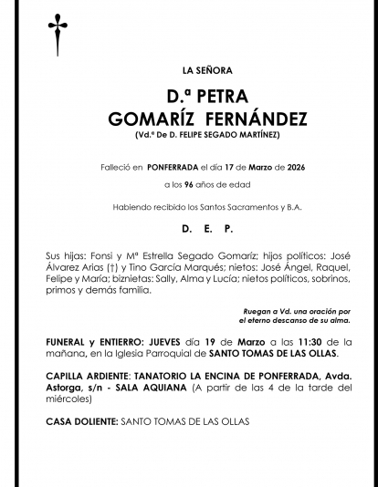 Esquelas PETRA GOMARÍZ FERNÁNDEZ Redacción Infobierzo 18 de Marzo de 2026 Actualizado: 18 de Marzo de 2026 a las 19:34 Comentarios Guardar PETRA GOMARÍZ FERNÁNDEZ PETRA GOMARÍZ FERNÁNDEZ Temas Esquelas Bierzo Esquelas Ponferrada Esquelas