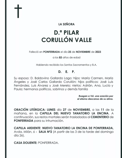 Esquelas PILAR CORULLON VALLE 26 de Noviembre de 2023 Comentarios Guardar PILAR CORULLON VALLE Temas Esquelas Bierzo Esquelas Ponferrada Esquelas