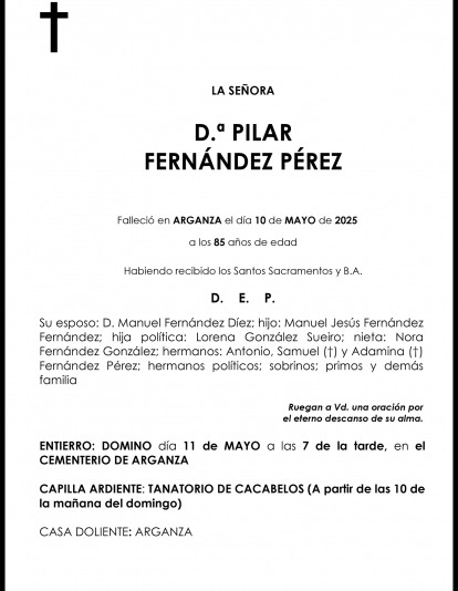 Esquelas PILAR FERNÁNDEZ PÉREZ Redacción Infobierzo 10 de Mayo de 2025 Comentarios Guardar PILAR FERNÁNDEZ PÉREZ Temas Esquelas Bierzo Esquelas Ponferrada Esquelas