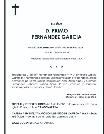 Esquelas PRIMO FERNANDEZ GARCIA 07 de Enero de 2024 Comentarios Guardar PRIMO FERNANDEZ GARCIA Temas Esquelas Bierzo Esquelas Ponferrada Esquelas