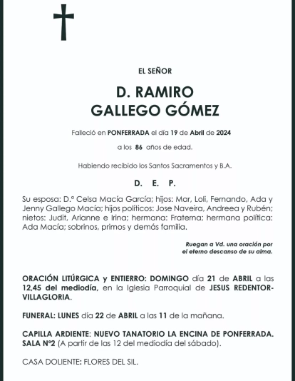 Esquelas RAMIRO GALLEGO GOMEZ 21 de Abril de 2024 Comentarios Guardar RAMIRO GALLEGO GOMEZ Temas Esquelas Bierzo Esquelas Ponferrada Esquelas