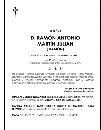 Esquelas RAMON ANTONIO MARTIN JULIAN Redacción Infobierzo 02 de Febrero de 2026 Comentarios Guardar RAMON ANTONIO MARTIN JULIAN RAMON ANTONIO MARTIN JULIAN Temas Esquelas Bierzo Esquelas Ponferrada Esquelas