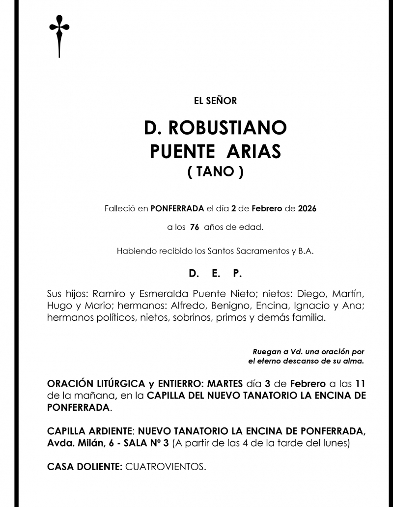 Esquelas ROBUSTIANO PUENTE ARIAS Redacción Infobierzo 02 de Febrero de 2026 Comentarios Guardar ROBUSTIANO PUENTE ARIAS ROBUSTIANO PUENTE ARIAS Temas Esquelas Bierzo Esquelas Ponferrada Esquelas