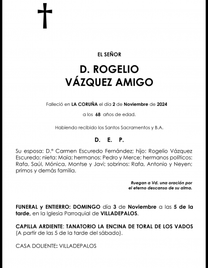 Esquelas ROGELIO VAZQUEZ AMIGO Redacción Infobierzo 02 de Noviembre de 2024 Comentarios Guardar ROGELIO VAZQUEZ AMIGO Temas Esquelas Bierzo Esquelas Ponferrada Esquelas