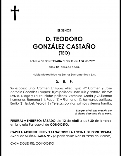 Esquelas TEODORO GONZALEZ CASTAÑO Redacción Infobierzo 11 de Abril de 2025 Comentarios Guardar TEODORO GONZALEZ CASTAÑO Temas Esquelas Bierzo Esquelas Ponferrada Esquelas