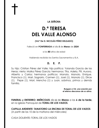 Esquelas TERESA DEL VALLE ALONSO 05 de Marzo de 2024 Comentarios Guardar TERESA DEL VALLE ALONSO Temas Esquelas Esquelas Ponferrada Esquelas Bierzo