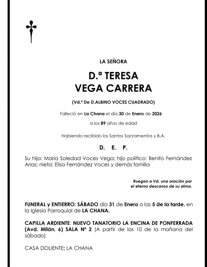 Esquelas TERESA VEGA CARRERA Redacción Infobierzo 30 de Enero de 2026 Comentarios Guardar TERESA VEGA CARRERA TERESA VEGA CARRERA Temas Esquelas Bierzo Esquelas Ponferrada Esquelas