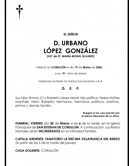 Esquelas URBANO LÓPEZ GONZÁLEZ Redacción Infobierzo 19 de Marzo de 2026 Actualizado: 19 de Marzo de 2026 a las 19:43 Comentarios Guardar URBANO LÓPEZ GONZÁLEZ URBANO LÓPEZ GONZÁLEZ Temas Esquelas Bierzo Esquelas Ponferrada Esquelas