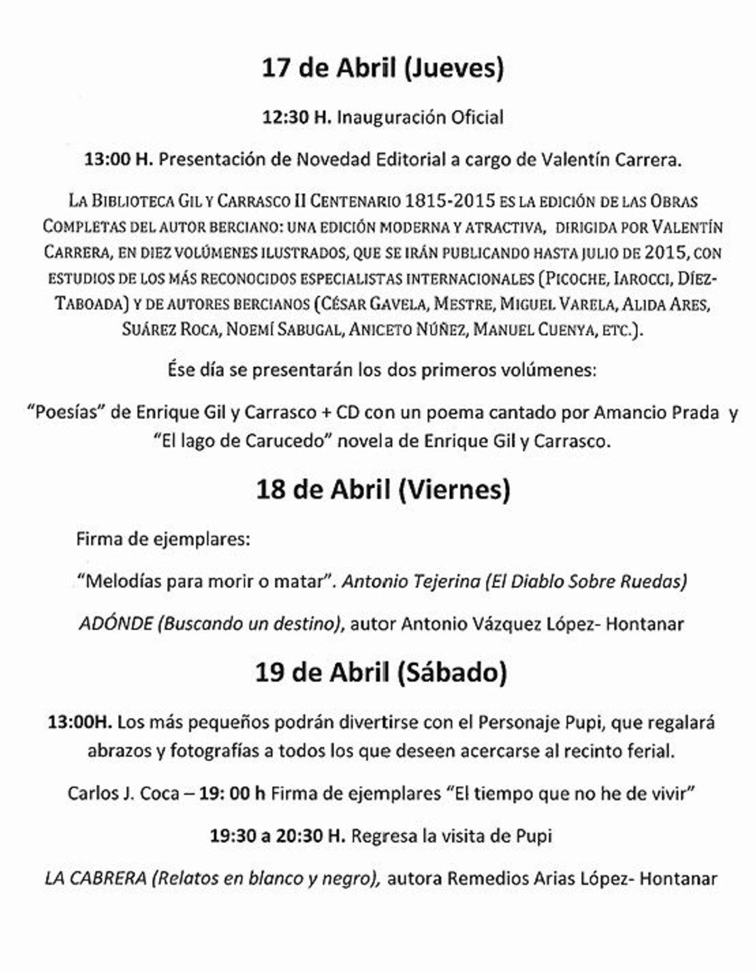 La Asociación de libreros de Ponferrada y la asociación ALVACAL (Asociación de libreros de Viejo y Antiguo de CyL) organizan un ano mas la Feria del Libro que marca la edición XIX.