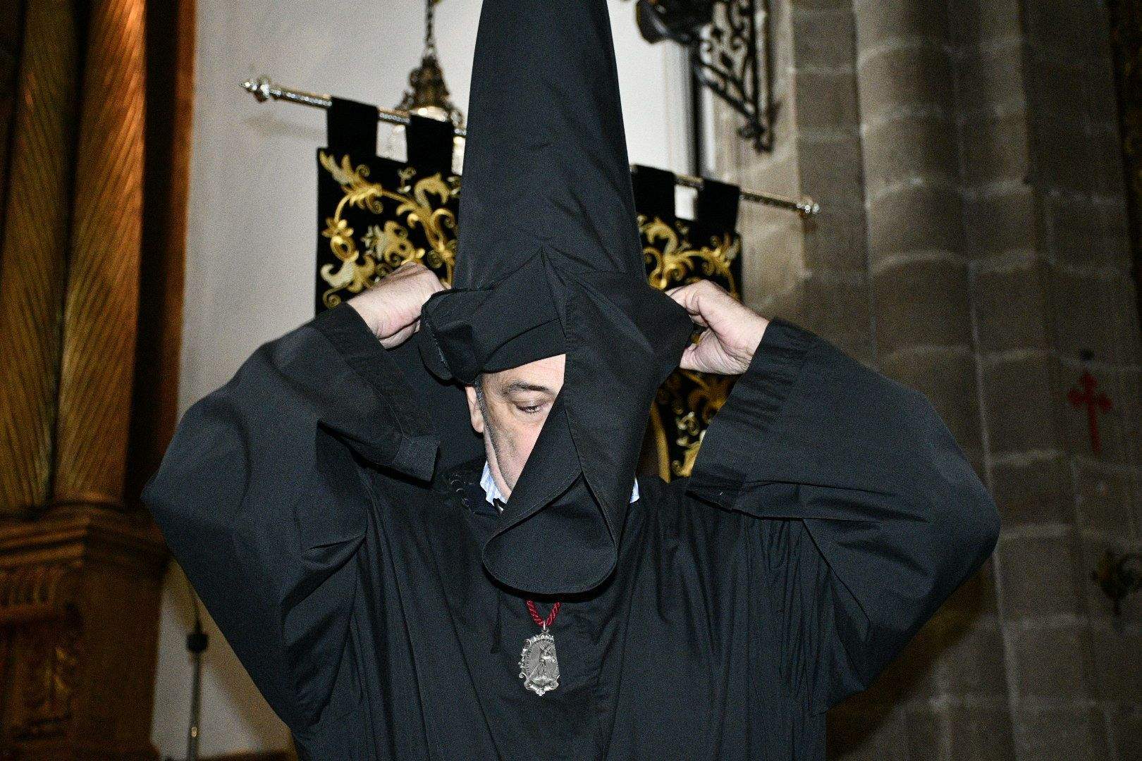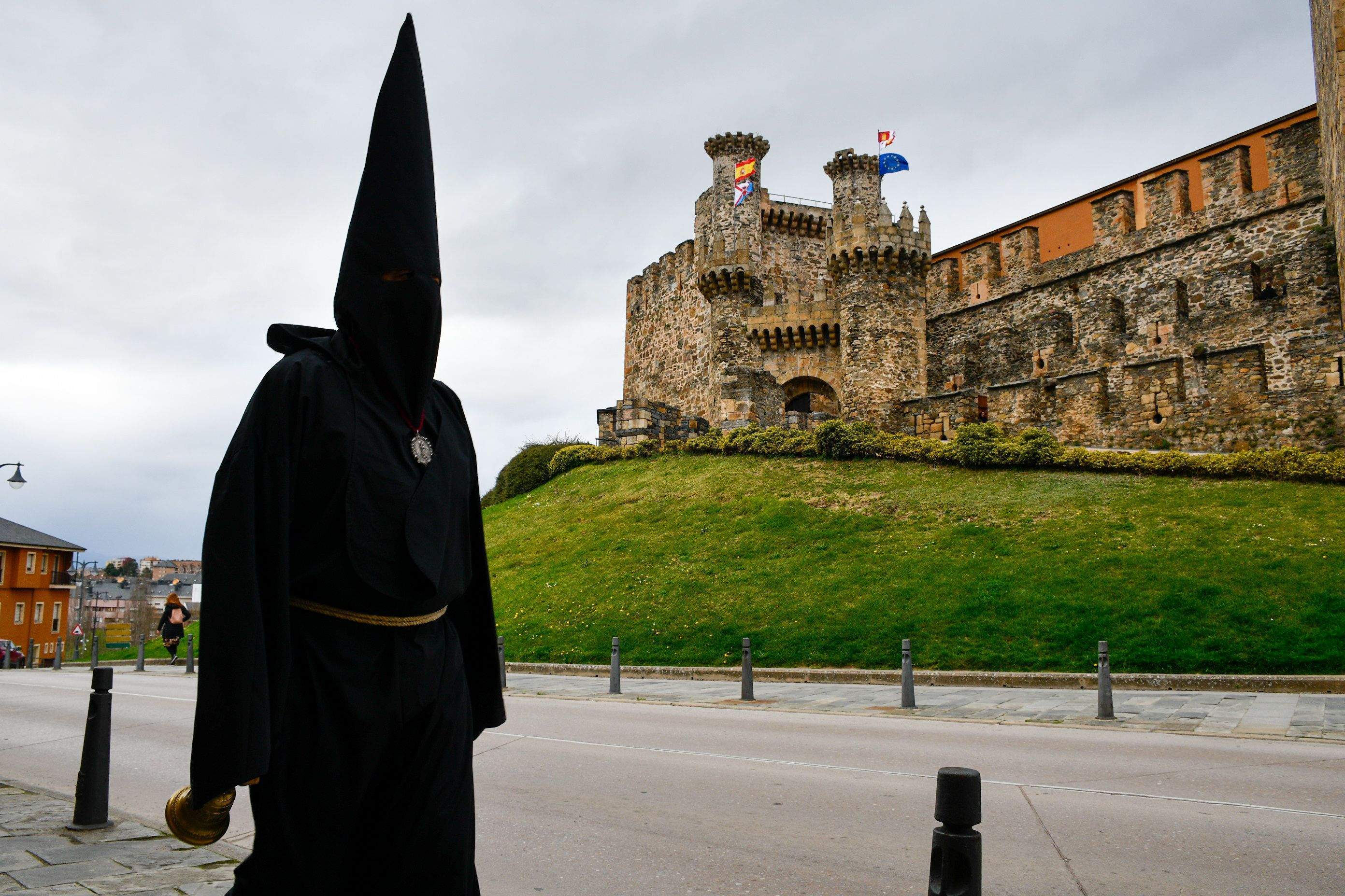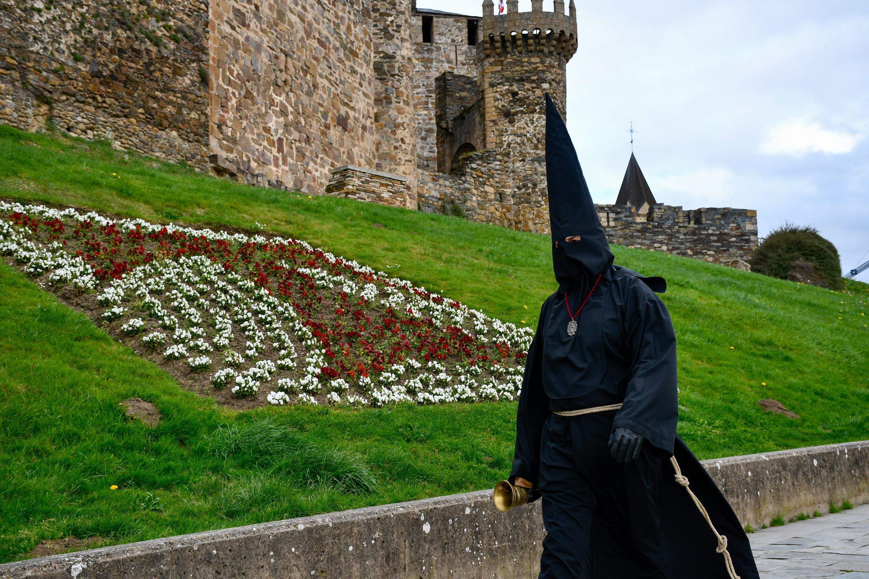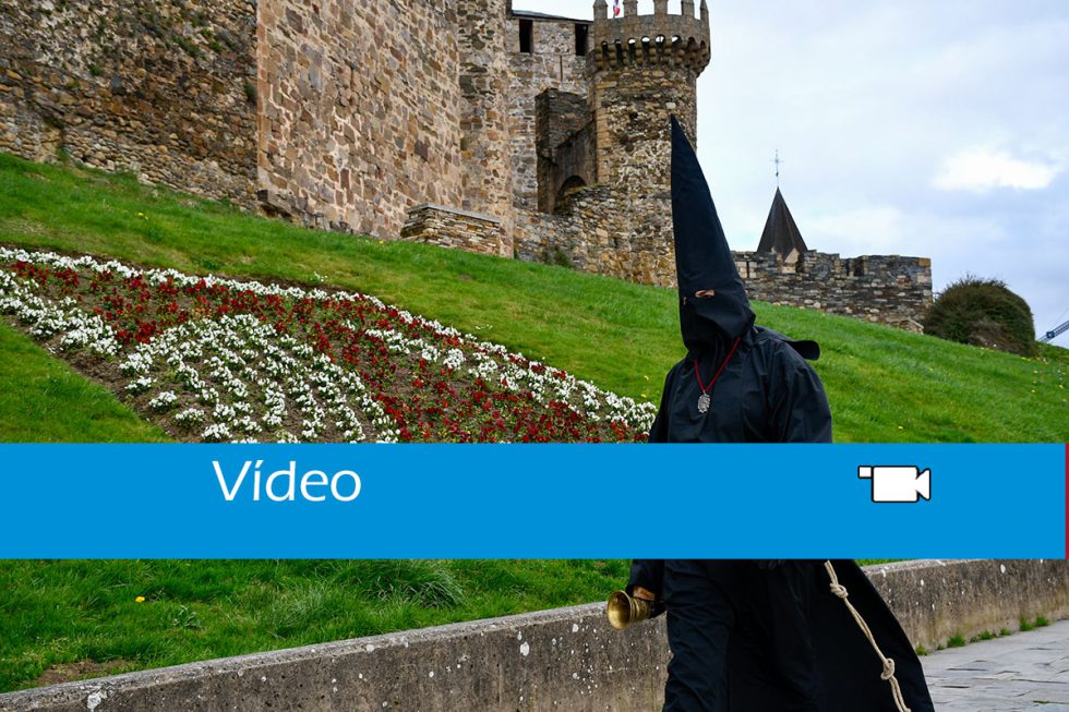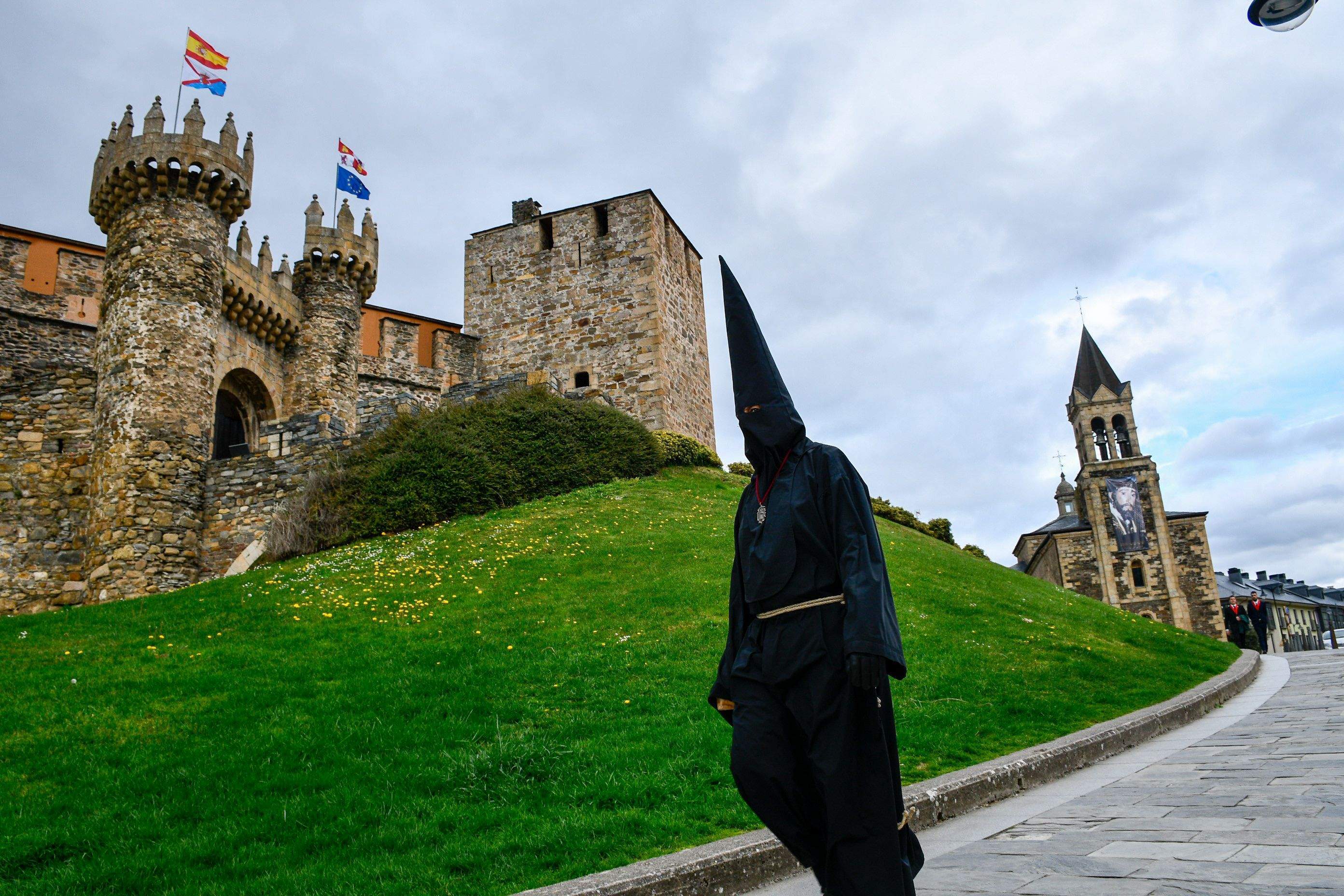 La solemne figura del Lambrión Chupacandiles recorrió con su sombra alargada y coronada por el reconocible capirote, las calles más históricas de Ponferrada. El sonido de su solitaria campana y de sus pasos, acompañados por niños, adviene la semana de pasión en la capital del Bierzo.
