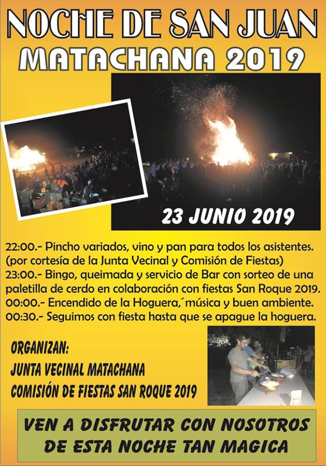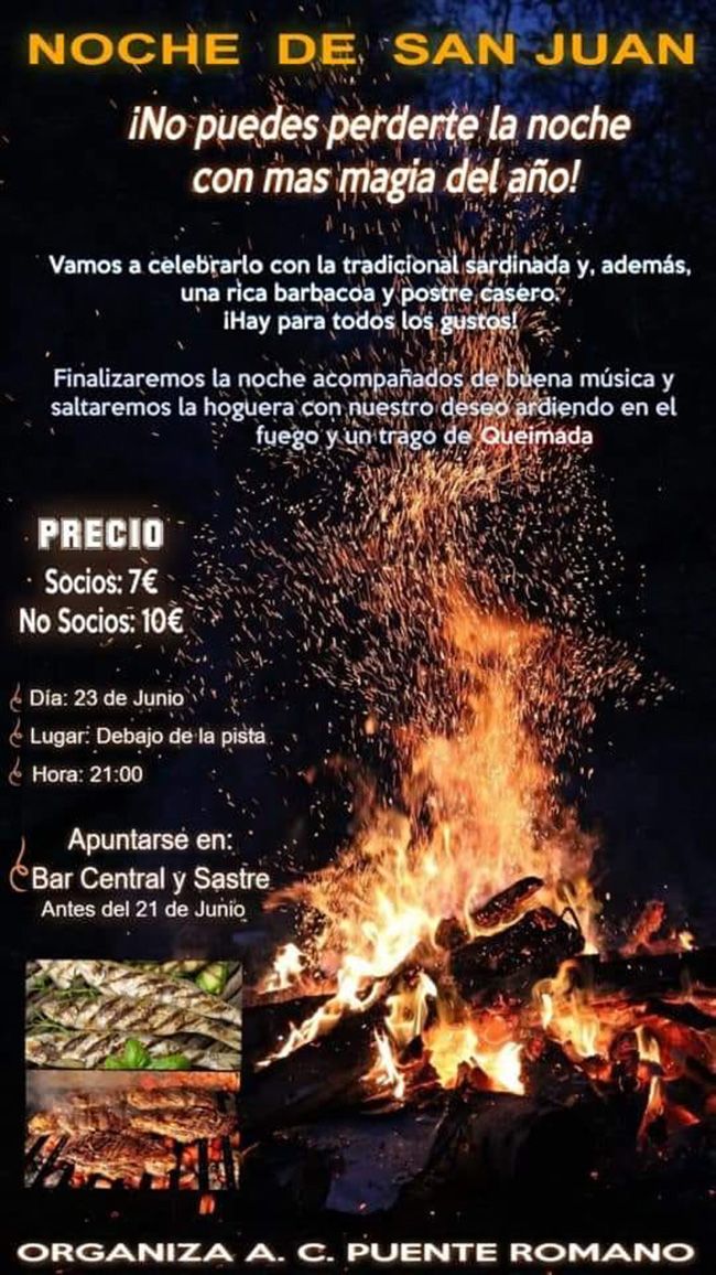 La Asociación Puente Romano del municipio organiza a partir de las 21 horas del 23 de junio la Noche de San Juan con sardinada, barbacoa y música, además del encendido y salto de la hoguera acompañado de la tradicional queimada. El precio para los socios es de 7€ y de 10€ para los no socios. El lugar elegido es debajo de la pista y habrá que apuntarse para participar antes del 21 de junio en el Bar Central y Sastre.