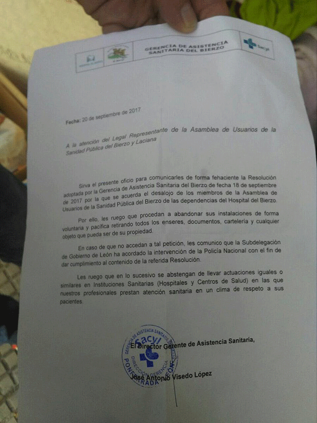 "En caso de que no accedan a tal petición", prosigue Visedo en el escrito, "les comunico que la Subdelegación de Gobierno de León ha acordado la intervención de la Policía Nacional con el fin de dar cumplimiento al contenido de la referida resolución".